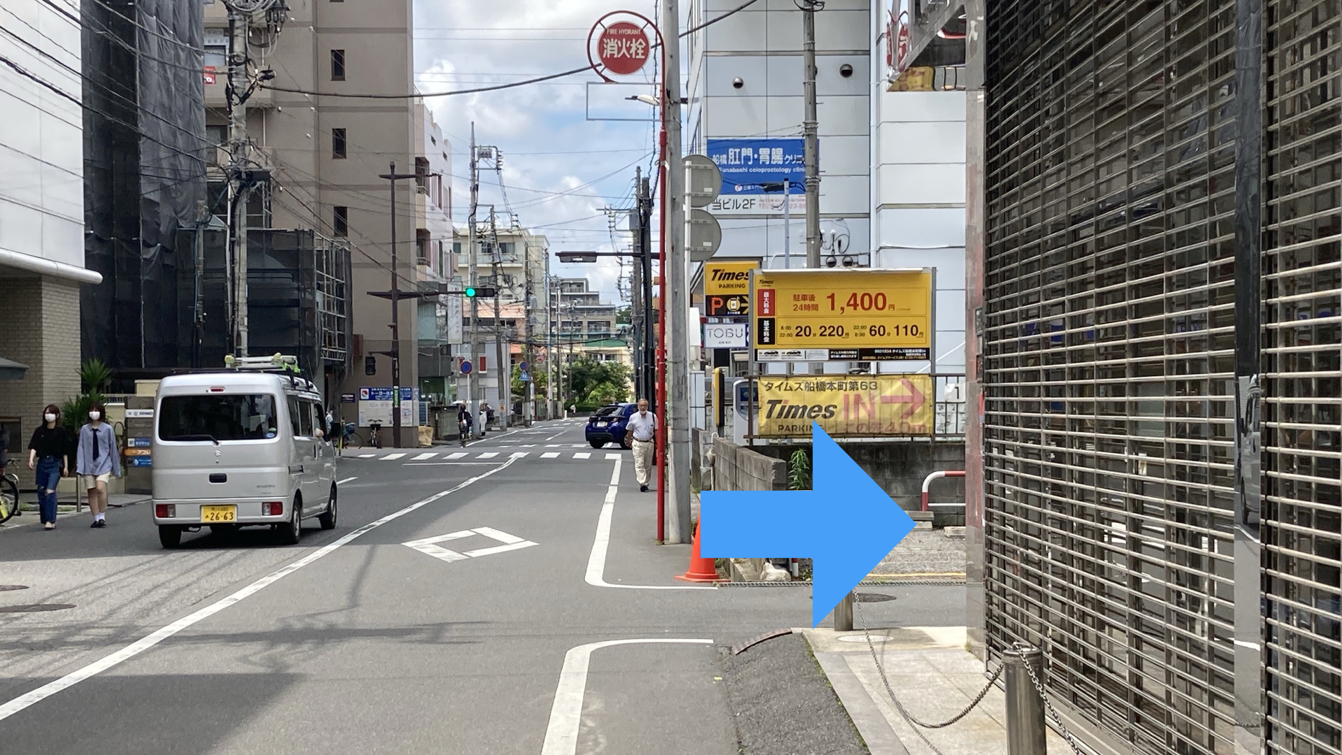 真っすぐ進んだ先の右側にタイムズの駐車場があるので、そこを右に入った左目の前に見えるビルになります。